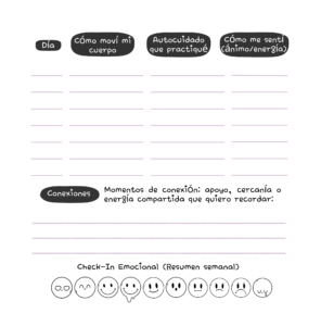 - Seguimiento semanal de: movimiento y cuerpo, autocuidado emocional