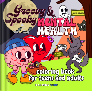 Groovy & Spooky Mental Health forma parte de Groovy Mind & Heart, una colección de Kaleida Vibe dedicada al bienestar emocional a través de la ilustración, el color, el humor y la escritura.